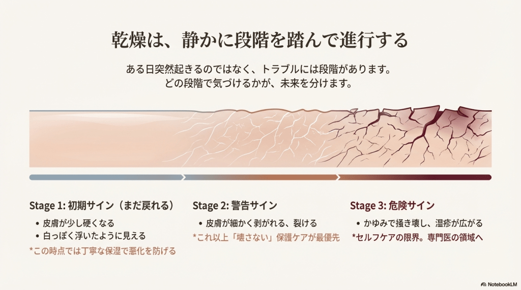 • ⚠️ 注意! ここで「乾燥しているから」と油分たっぷりのオイルなどを塗ると、菌にエサを与えることになり、炎症が悪化する「二重の罠」に陥ります。