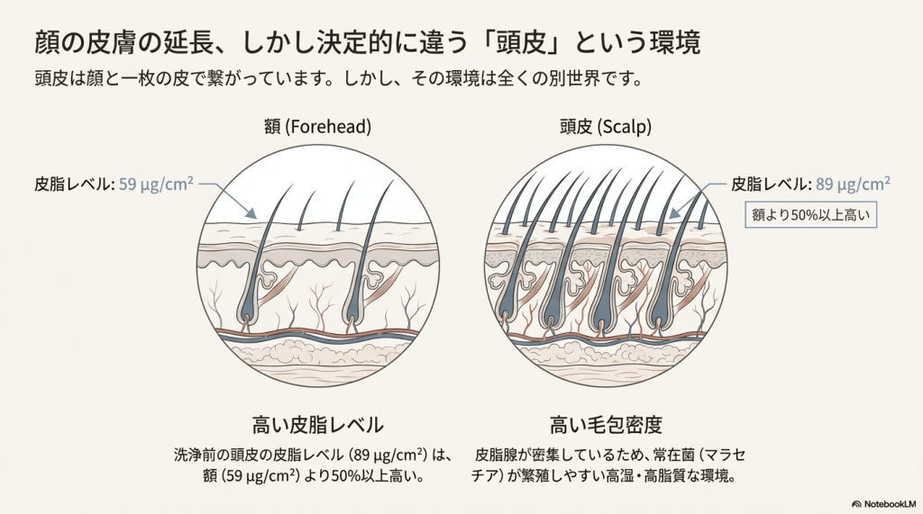 生理学的に見て、頭皮と顔(特に額)には圧倒的な環境の差があります。