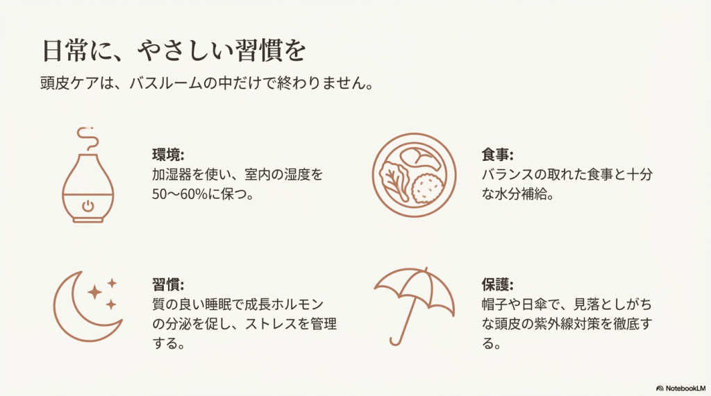 「密林」である頭皮を健やかに保つための、3つの具体的なアクションプランです。