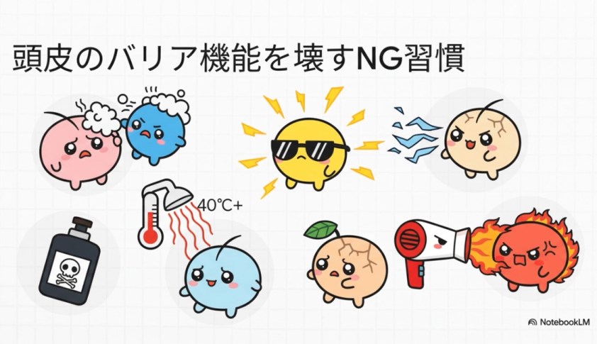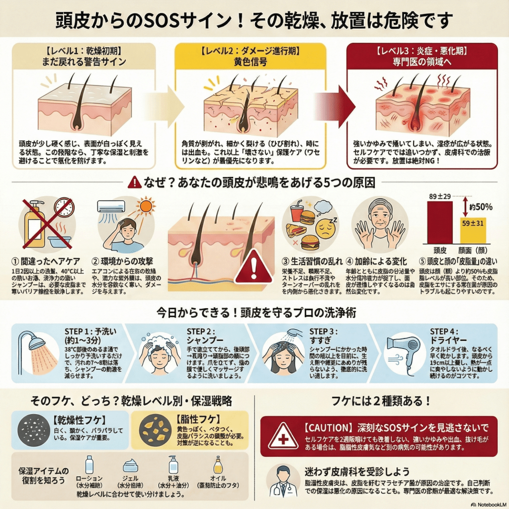 顔の乾燥は単純に「油分・水分不足」が多いですが、頭皮の乾燥は「皮脂は多いのに、バリア機能が壊れている」、あるいは「洗いすぎで皮脂を取りすぎている」という複雑な原因がほとんどです。